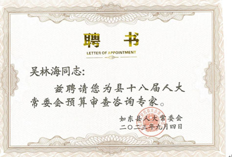 被聘為如東縣人大常委會2023年9月4日聘為縣十八屆人大常委會預(yù)算審查咨詢專家。